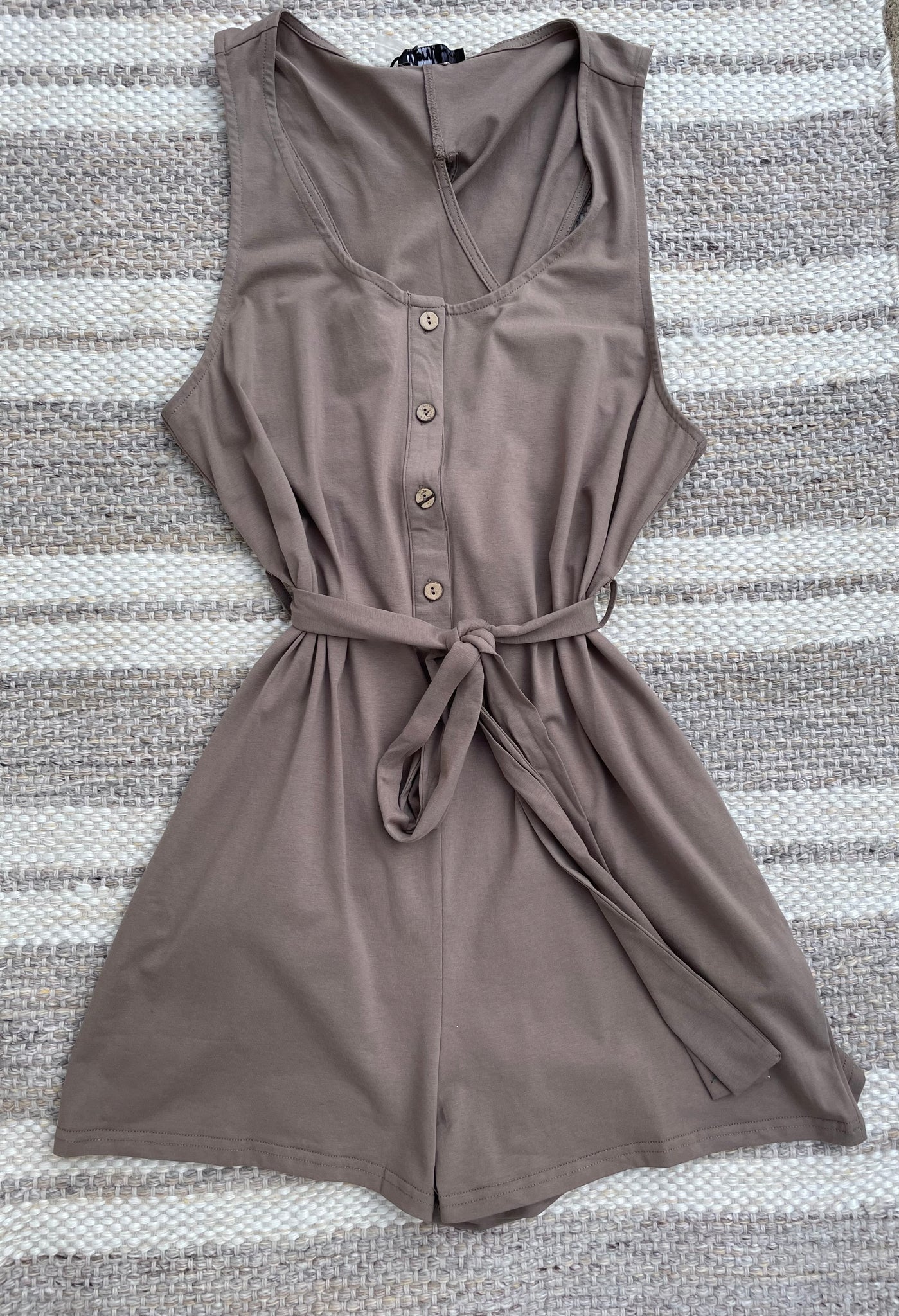 The perfect Taupe colored romper! This cute romper has functional front buttons, with a tie at the waist detail.